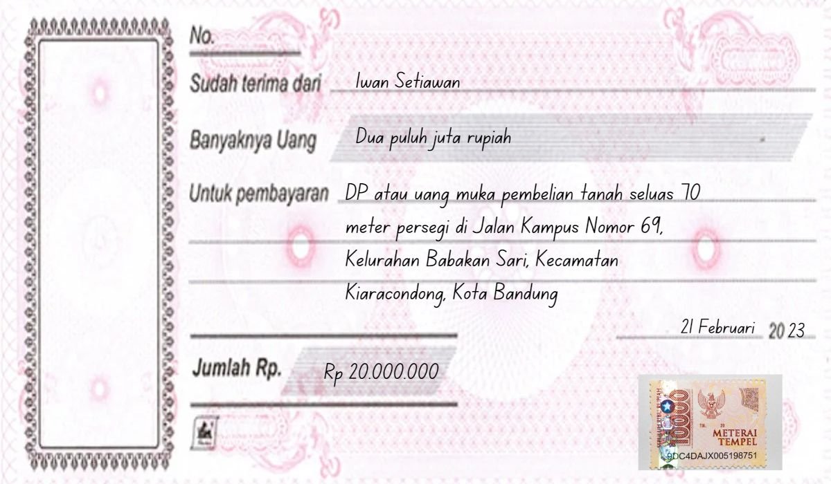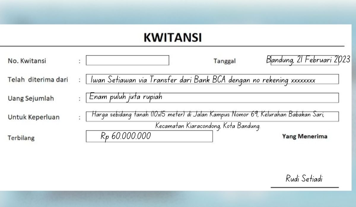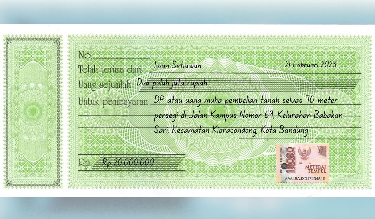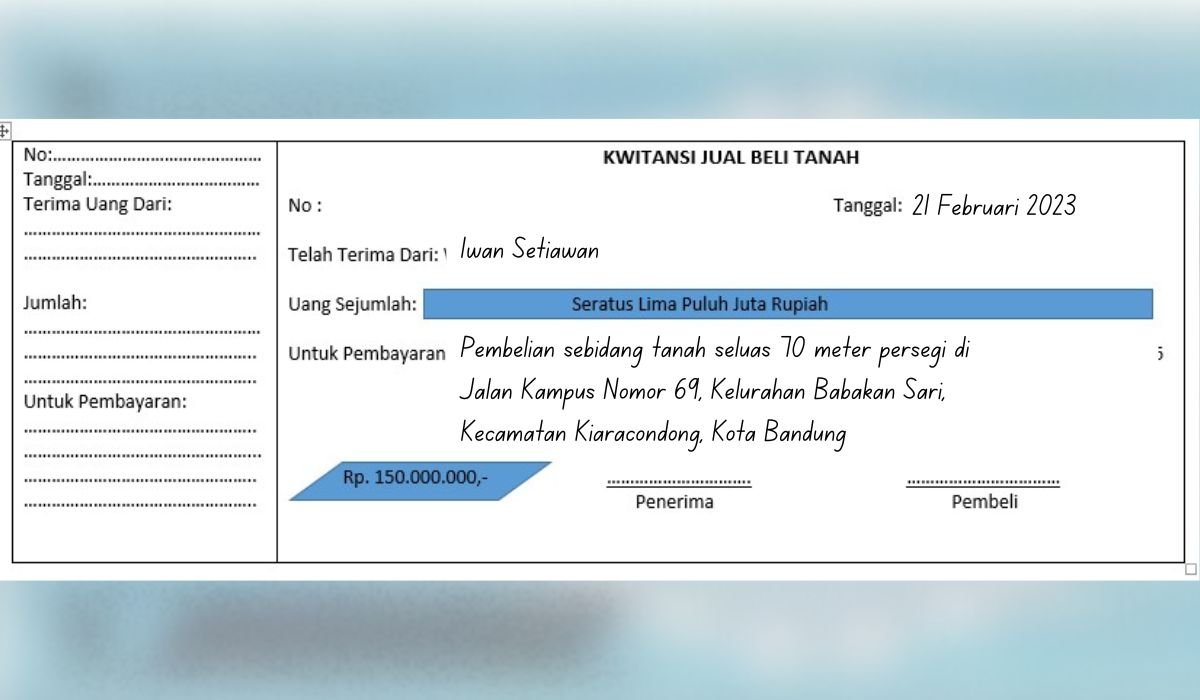 Sebagai informasi tambahan, dalam proses jual beli tanah, kwitansi harus dibuat di luar dokumen lainnya, seperti surat perjanjian jual beli tanah dan akta jual beli tanah.