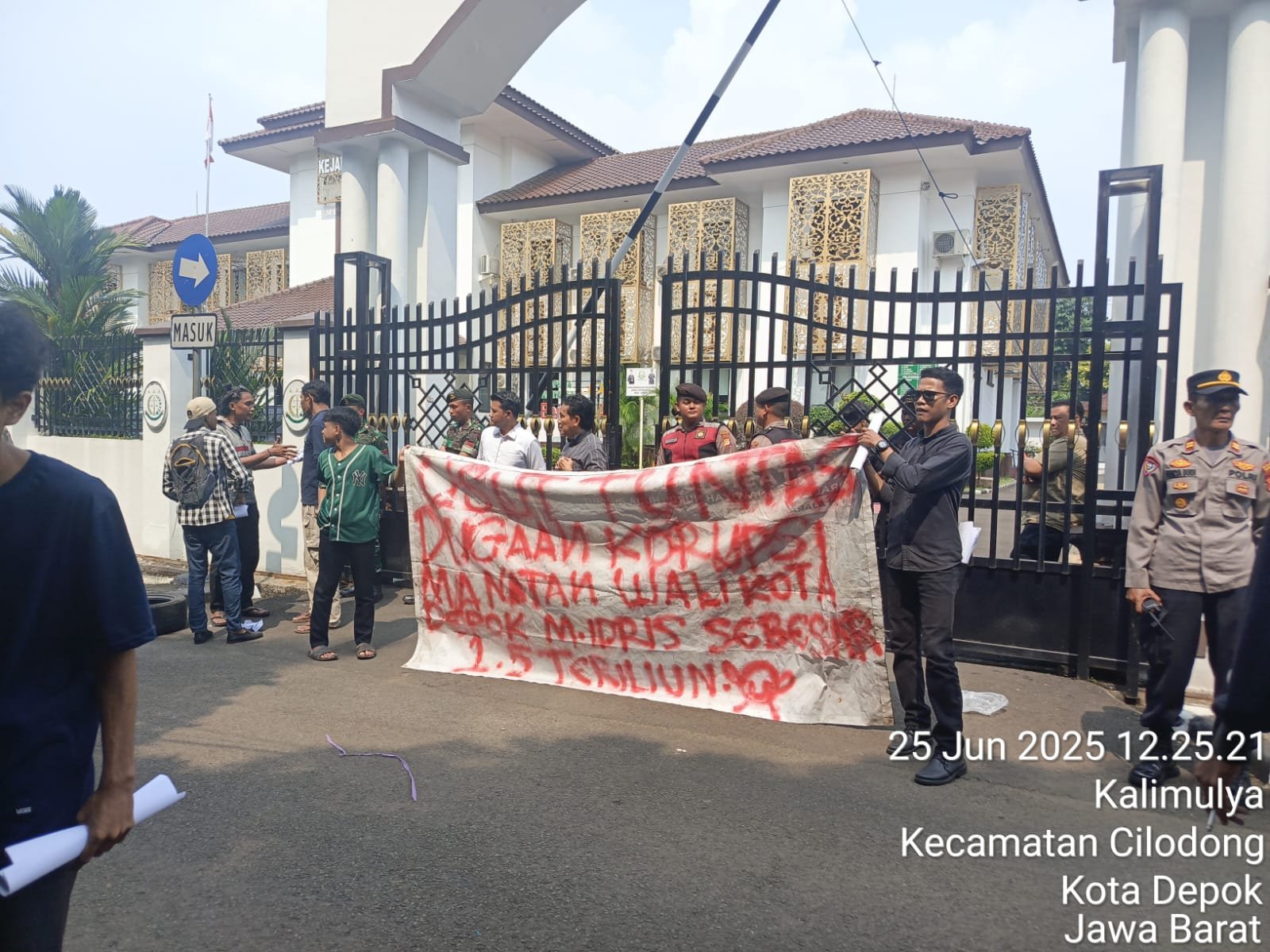“Risal M. Nur , salah satu orator aksi menegaskan kepada kejaksaan negeri kota depok, agar segera menyelidiki kasus tidak pidana korupsi yang diduga kuat menyalahgunakan kekuasaan yang dilakukan oleh berapa oknum pejabat diantaranya adalah mantan walikota depok Muhammad Idris, Kepala BKD Kota depok Wahid Suryoni, Kabid PAD FADLI, dan Supian Suri yang mana saat ini sebagai Wali Kota Depok,”tuturnya.