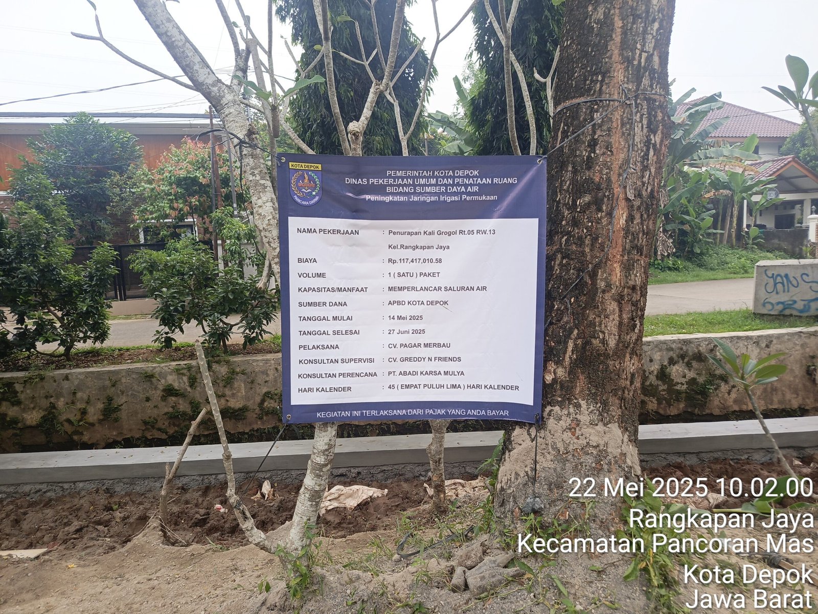 Proyek penunjukan langsung (PL), yang ditunjuk oleh bidang sumber daya air (SDA) sebagai pelaksana, CV PAGAR MERBAU, diawasi konsultan supervisi, CV GRENDDY N FRIENDS, sebagai perencana pembangunan, PT ABADI KARSA MULYA. Proyek senilai 117,417,010,58 juta rupiah anggaran pendapatan dan belanja daerah (APBD) kita Depok tahun anggaran 2025