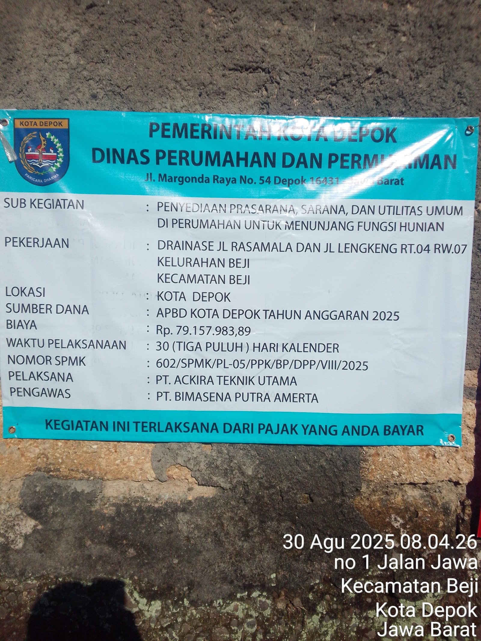 Depok – Proyek drainase di Jl. Lengkeng – Jl. Rasamala, Perumahan Depok Utara, kini menuai sorotan tajam. Meski sudah dimulai sejak 18 Agustus 2025, hasil pekerjaan yang ditangani PT Ackira Teknik Utama dianggap gagal total. Banjir dan pengumpulan kembali terjadi ketika hujan deras turun pada Jumat (30/08/2025).